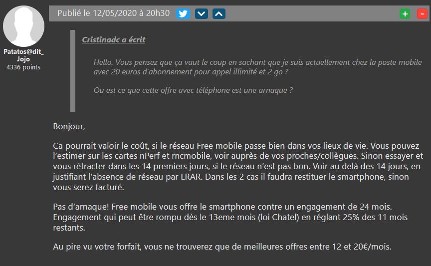 Parfois, il faut simplement demander son avis aux concernés avant de faire un choix ! Alors Cristinadc a voulu savoir si la nouvelle vente privée de Free Mobile lancée mardi dernier valait le coup. Et loin de tout dénigrement gratuit ou au contraire, encensement irrationnel de l’opérateur, certains n’hésitent pas à donner un avis honnête, avec les points à vérifier et les bons points.