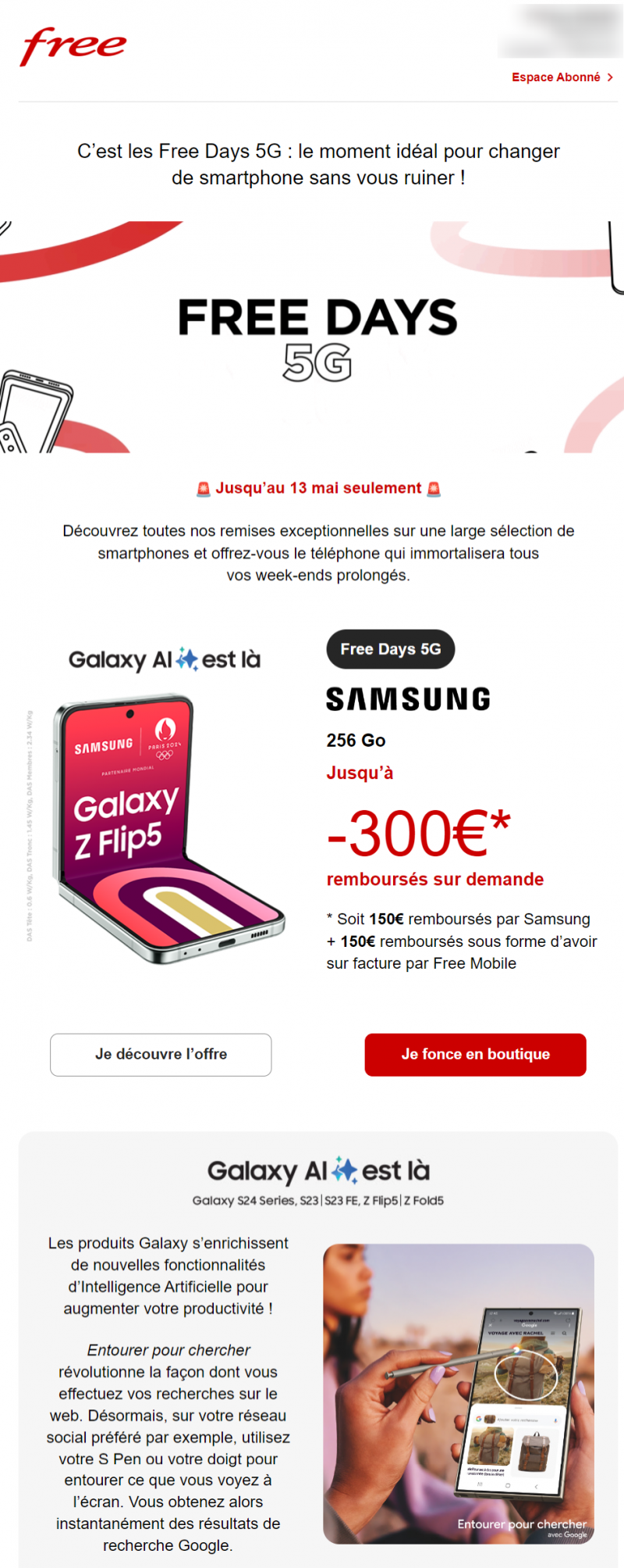 Et pour inaugurer le lancement de ces Free days 5G”, l’opérateur envoie un mail à ses abonnés pour annoncer une première promo jusqu’à 300€ sur le Galaxy Z Flip5, soit 150€ remboursés par Samsung et 150€ d’avoir sur vos prochaines factures Free Mobile. Vous pouvez retrouver les détails de cette offre sur cette page.