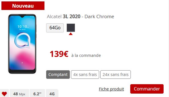 - L’Alcatel 3L 2020 est ainsi proposé pour 139€ en achat au comptant, il est également possible de le payer en 4 fois sans frais, moyennant 37€ lors de la première commande, puis trois fois 34€ sans frais. Si vous souhaitez échelonner votre paiement pendant plus longtemps, vous pouvez payer 19€ à la commande, puis 24 fois 5€ sans frais.