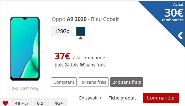L’Oppo A9 édition 2020 est proposé dans la boutique de Free Mobile au prix de 229€ à la commande. Vous pouvez également l’acheter en 4 fois sans frais, pour 58€ puis trois fois 57€. Il est possible d’échelonner votre paiement sur une plus longue période, comptez alors 37€ à la commande puis 24 fois 8€ sans frais.
