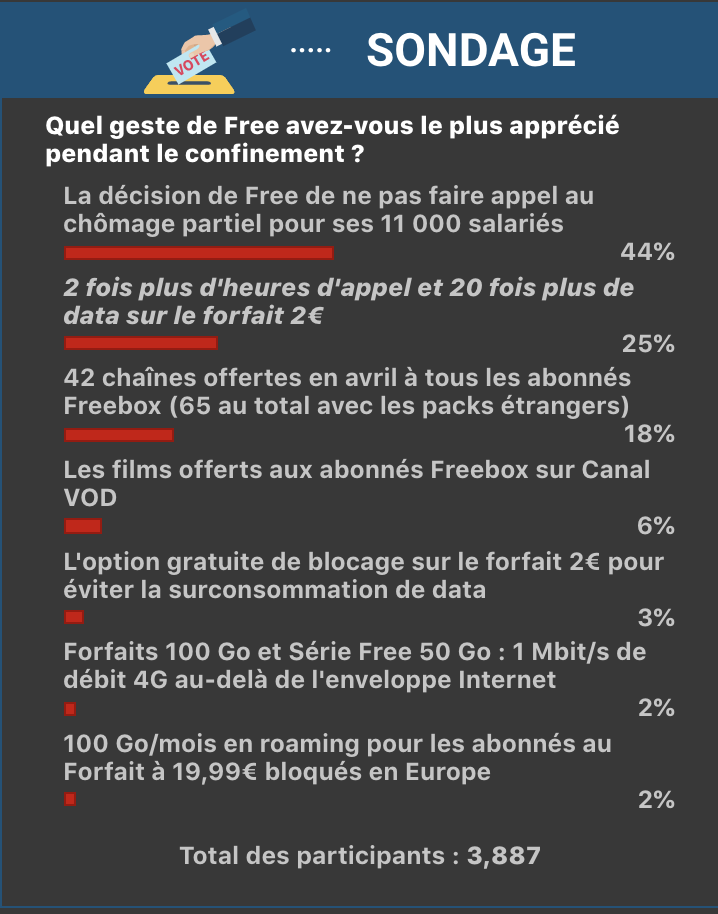 “Quel geste de Free avez-vous le plus apprécié pendant le confinement ? ” La question vous a été posée le mois dernier à l’heure où l’opérateur a multiplié les initiatives en interne et envers ses abonnés mobiles et box. Les résultats sont aujourd’hui sans appel : sur les 3887 votants entre le 20 avril et le 15 mai 2020, 44% ont préféré la décision d’Iliad de ne pas recourir au chômage partiel pour ses 11 000 collaborateurs, comme Orange et à contrario de SFR et Bouygues.