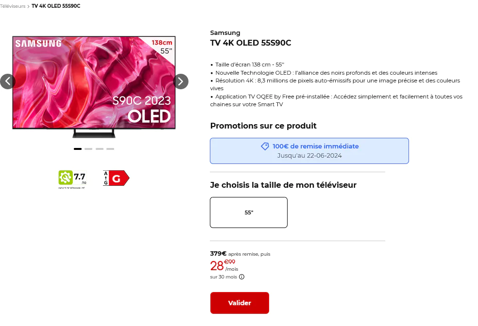 S’il vous faut un nouveau téléviseur sans pour autant payer trop d’un coup, vérifiez dans votre espace abonné Freebox. Ce dernier dispose d’une boutique dédiée à des modèles de Smart TV Samsung proposés avec un paiement sur 30 mois. Des promotions sont souvent lancées et c’est le cas pour un modèle assez intéressant embarquant une dalle OLED.