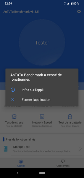 AnTuTu n’a tout simplement pas fonctionné. Nous avons essayé trois fois et terminé avec trois plantages en cours de route. Un peu têtus (ou optimismes, c’est selon), nous avons retenté une fois quelques jours plus tard. Même résultat.
