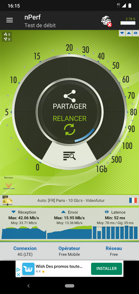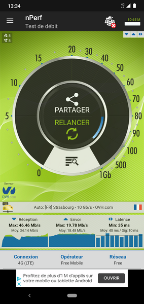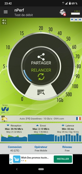 Le Nokia 2.3 supporte la B28, soit la 4G 700 MHz sur laquelle a beaucoup misé l’opérateur de Xavier Niel pour son réseau mobile. Durant notre test, il n’a jamais atteint les 100 Mbit/s en réception, même dans des endroits où d’autres smartphones approchaient les 150 Mbit/s.