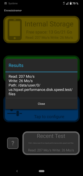 Pour ceux qui aiment les benchmarks, l’outil Disk Speed nous indiquait 26 Mo/s en écriture et 207 Mo/s en lecture pour la mémoire interne. Cela explique les installations assez lentes de nos jeux.