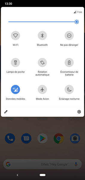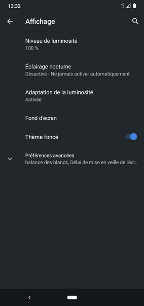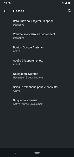 En choses pratiques, il y a le bouton dédié pour lancer Google Assistant sur la tranche gauche du smartphone, le mode sombre, la possibilité de rejeter un appel en retournant le smartphone (Système/Gestes) et le choix de naviguer à la gestuelle ou avec deux boutons virtuels.