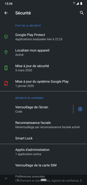 Nous avons reçu le smartphone neuf et au moment où la mise à jour Android 10 arriverait. Nous avions ainsi la dernière version en date de l’OS de Google. La mise à jour s’accompagnait d’ailleurs des patchs de sécurité du mois de mars 2020.