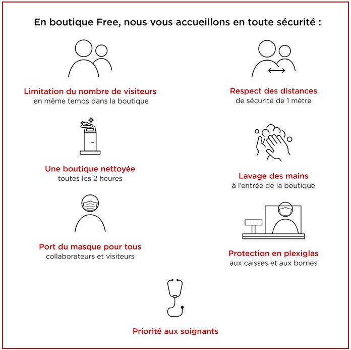 Cette réouverture se fait avec des mesures sanitaires strictes que l’opérateur de Xavier Niel a déjà présenté la semaine dernière et affiche également sur son site web. A noter que le nombre de visiteurs simultanés est limité à 2, 3 ou 4 selon la taille du Free Center.
