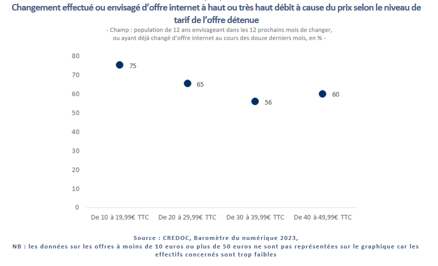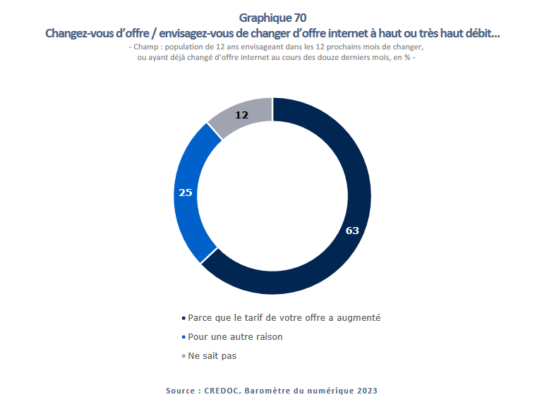 En effet, parmi ceux qui envisagent de partir ailleurs ou qui l’ont déjà fait, 63% expliquent avoir été motivé par l’augmentation du tarif de leur box. 68 % des 25-39 ans mentionnent l’augmentation des prix contre 53 % des 60-69 ans et 49 % des 12-17 ans. 78 % des cadres et professions intellectuelles supérieures (contre 55 % des retraités et 54 % des autres inactifs) et 77 % des habitants d’agglomération parisienne (contre 54 % des habitants des communes rurales et 52 % des habitants des communes de 2 000 à 19 999 habitants) mentionnent l’augmentation des prix comme élément déclencheur du désir de changement.