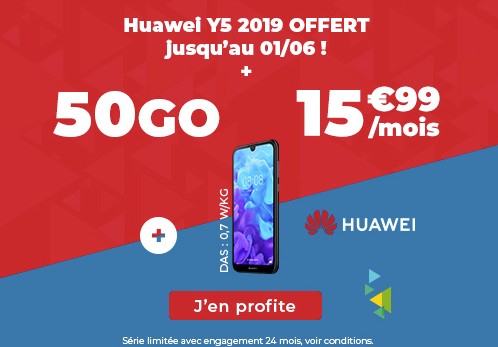 Auchan Telecom se lance également sur ce type d’offres. Il commercialise en effet un forfait appels/SMS/MMS illimités + 50 Go de data mobile à 15,99 euros avec un engagement de 24 mois qui inclut un smartphone Huawei Y5 2019 offert (qui coûte normalement 129 euros). La promotion est valable jusqu’au 1er juin. Là aussi, la carte SIM triple découpe revient à 10 euros.