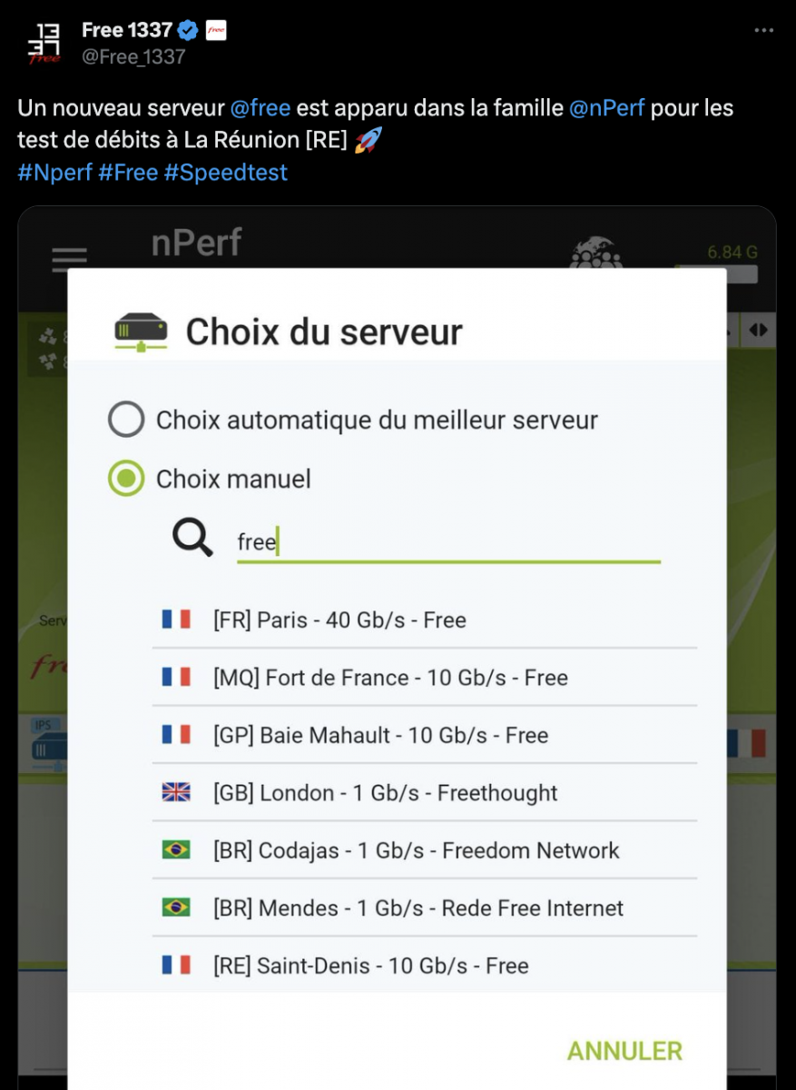 Free a récemment annoncé, via son compte Free1337 sur X, avoir déployé un nouveau serveur nperf à La Réunion. Ce déploiement clôture enfin la boucle, après la France hexagonale et les Caraïbes.