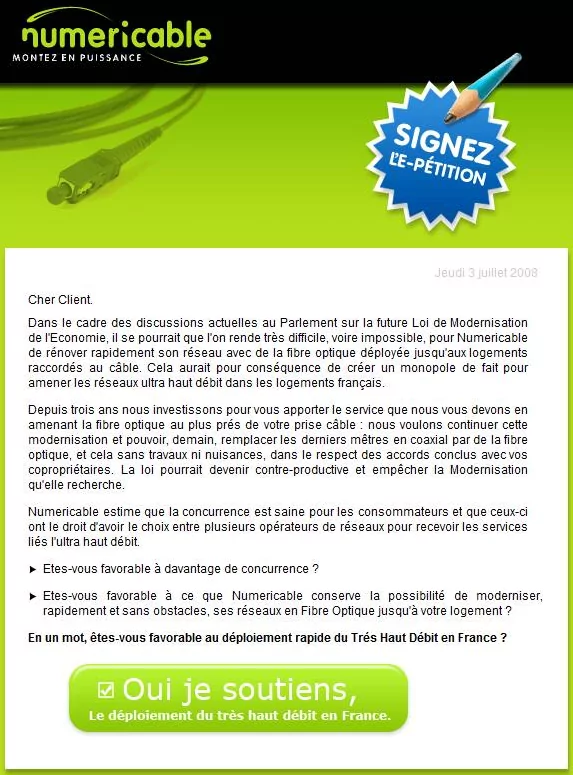 Pour le développement rapide du Très Haut Débit en France, Numéricable a trouvé la seconde parade, vicieuse, l’astuce bien plus "surprenante" pour convaincre les internautes d’appuyer son offre "Montez en puissance". En effet, plusieurs internautes nous indiquent qu’ils ont reçu des emails provenant de Numéricable, leur proposant de s’engager et de signer une e-pétition – Ou devrais-je dire un doux camouflet !