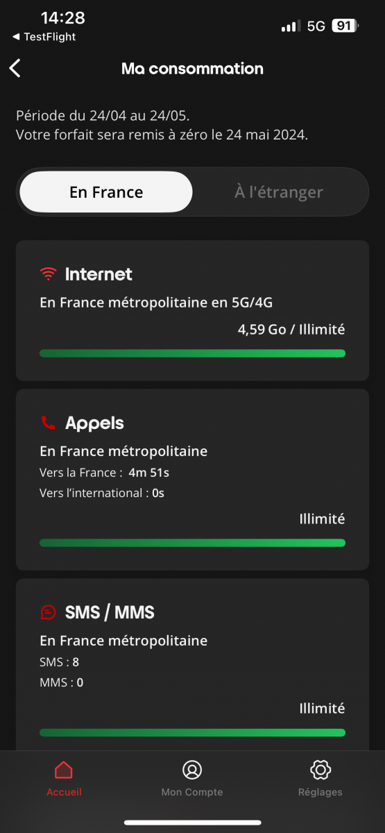 Une fois sur la page d’accueil, vous allez avoir accès à plusieurs sections, à savoir la rubrique factures, qui vous permet de retrouver et télécharger l’historique des 12 dernières factures Free Mobile, mais aussi et peut être le plus intéressant, la rubrique “Consommation”, qui vous permet de suivre combien de votre enveloppe data vous avez dépensé, combien d’appels et SMS/MMS vous avez envoyés. Vous pouvez passer de la consommation en France à celle à l’étranger en un clic sur.