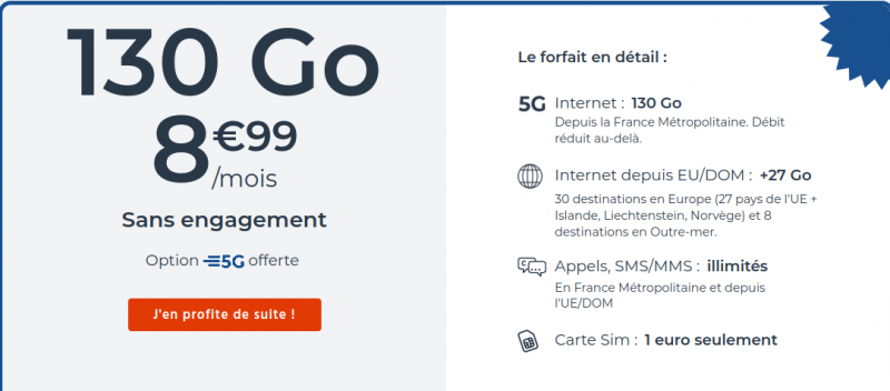 La 5G à petit prix avec ce forfait sans engagement proposé par Cdiscount Mobile. En effet, le MVNO offre la 5G dans son forfait 130 Go à 8,99 € par mois. À cela s’ajoute les appels, SMS et MMS illimités en France Métropolitaine ainsi que l’UE et DOM. Concernant la data à l’étranger, vous pouvez profiter de 27 Go d’internet dans 30 destinations en Europe (27 pays de l’UE + Islande, Liechtenstein, Norvège) et 8 destinations en Outre-mer. Lors de la commande du forfait, la carte SIM triple découpe est proposé à 1 €.