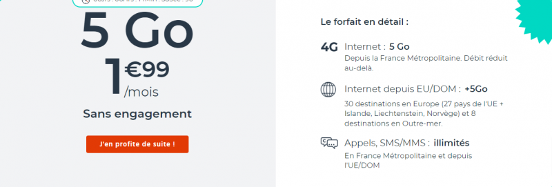 Jusqu’au 12 juin prochain, Cdiscount Mobile propose un forfait à tout petit prix. En effet, pour moins de 2 € par mois, vous pouvez profiter d’une enveloppe data de 5 Go en 4G sur le réseau de Bouygues Telecom. À cela s’ajoute évidemment les appels, SMS et MMS en illimités ainsi que 5 Go d’internet depuis l’Europe et les DOM (27 pays de l’UE + Islande, Liechtenstein, Norvège) et 8 destinations en Outre-mer. Lors de la commande, la carte SIM triple découpe vous sera facturée 5 €.