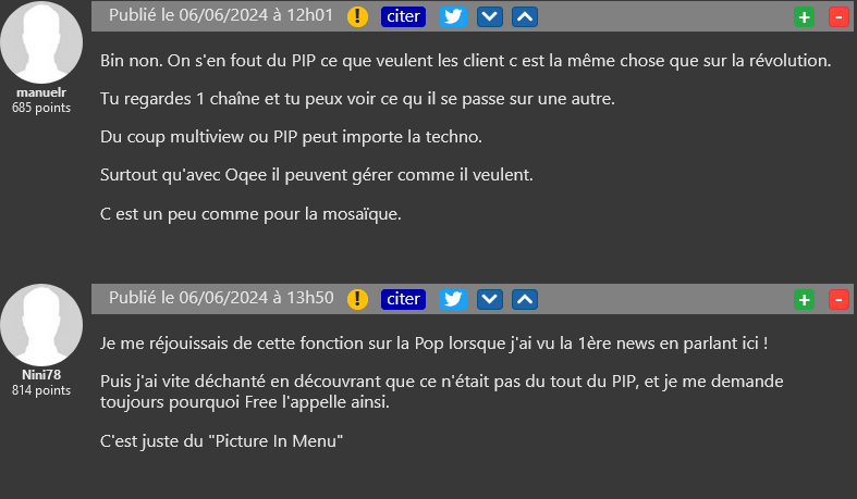 Accessible sur pléthore d’appareils, la fonctionnalité Image dans l’Image permet chez Free de continuer à profiter de vos contenus tout en utilisant d’autres applications. Disponible sur l’application Oqee by Free sur mobiles et tablettes Android, Player TV Free 4K, Android TV, Fire TV, et Apple TV, le “Picture-in-Picture” de Free comporte hélas toutefois quelques limites. En effet, seule la version Apple TV de l’interface TV de Free permet d’utiliser cette fonctionnalité “pour lire deux flux TV simultanément, avec le son joué uniquement sur le flux en PIP” indique l’opérateur. Et c’est pourtant là l’intérêt réel de cet outil à la base, une fonctionnalité qui marche même sur le Player Révolution vieux de plus de 10 ans…. Forcément, les abonnés n’apprécient pas cette présence en demi-teinte…