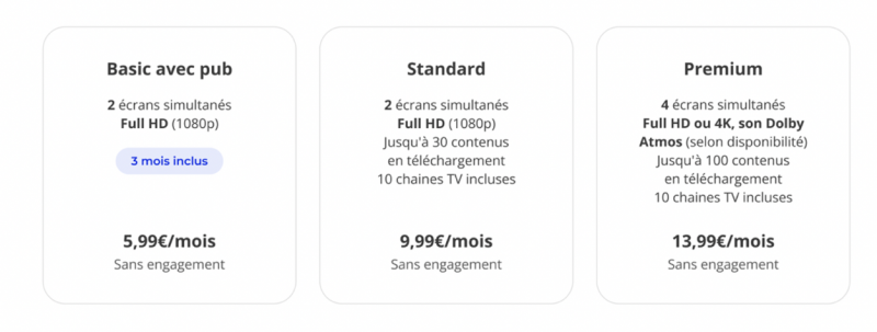 Les autres abonnés Freebox, à savoir Freebox Révolution, mini 4K et Delta, bénéficient de ce même abonnement pendant 1 mois (puis 5,99€/mois). Celui-ci inclut 2 écrans en simultané avec une qualité HD.