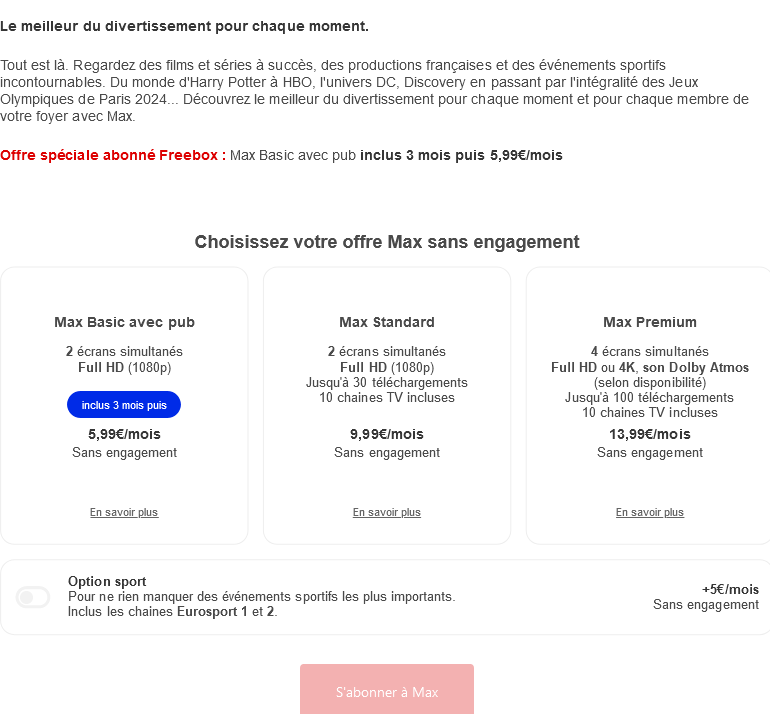 Chaque offre est sans engagement et vous pouvez à tout moment résilier Max si vous n’êtes pas convaincus. À noter, pour souscrire, il est impératif d’être connecté à sa Freebox. Il est également possible d’activer une option sport, donnant accès à Eurosport 1 et 2 pour 5€/mois.