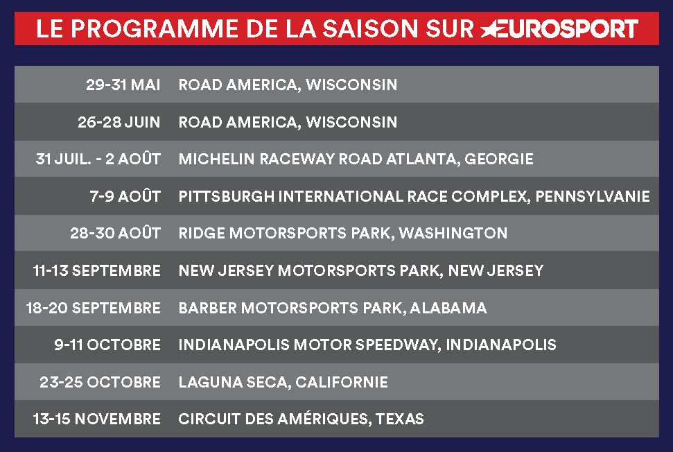 Dès 21h, le samedi retrouvez sur Eurosport 2 la catégorie Supersport puis à 22h la catégorie Superbike, les étapes se dérouleront sur le mythique circuit Road America dans le Wisconsin. Le dimanche, retrouvez la course Superbike à partir de 20h puis la catégorie Supersport à 21h.