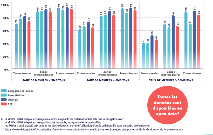 A cela s’ajoute des différences selon les opérateurs. Les données de l’Arcep indiquent en effet qu’atteindre certains seuils est plus ou moins difficile pour d’autres opérateurs selon les endroits. On peut ainsi noter que pour ce qui est d’atteindre les débits minimums pour accéder au web, ce sont Bouygues Telecom et SFR qui sont les plus mauvais élèves dans les zones rurales (71% et 75%) et dans les zones intermédiaires (90 et 91%), mais Free Mobile est pour sa part légèrement en retard avec 93% dans les zones denses, contre 94% chez SFR, 96% chez Bouygues Telecom. Orange, pour sa part, est leader dans toutes ces zones.