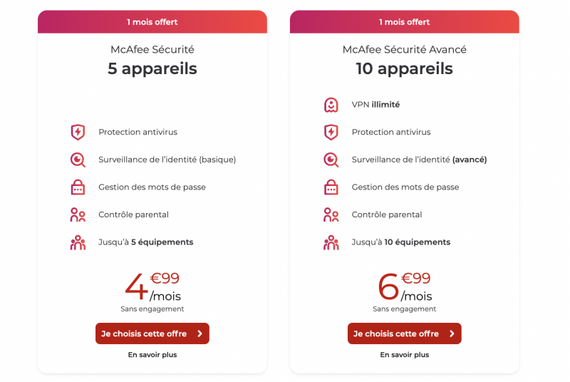 Les abonnés Freebox ayant déjà souscrit à l’une des options McAfee Sécurité (4,99€/mois) et McAfee Sécurité Avancé (6,99€) peuvent profiter dès à présent et sans surcoût de cet enrichissement.