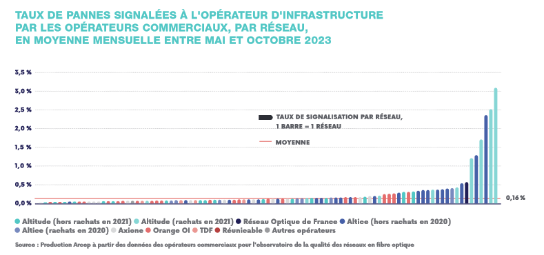 Ainsi, sur ces réseaux qui sont utilisés par Orange et consorts mais gérés par des OI, lorsqu’une panne est repérée, elle est signalée par l’opérateur commercial à destination de celui qui s’occupe du réseau. Dans son dernier rapport “Territoires connectés”, l’Arcep a recensé le taux de pannes signalées à l’opérateur d’infrastructure, en moyenne mensuelle entre mai et octobre 2023.