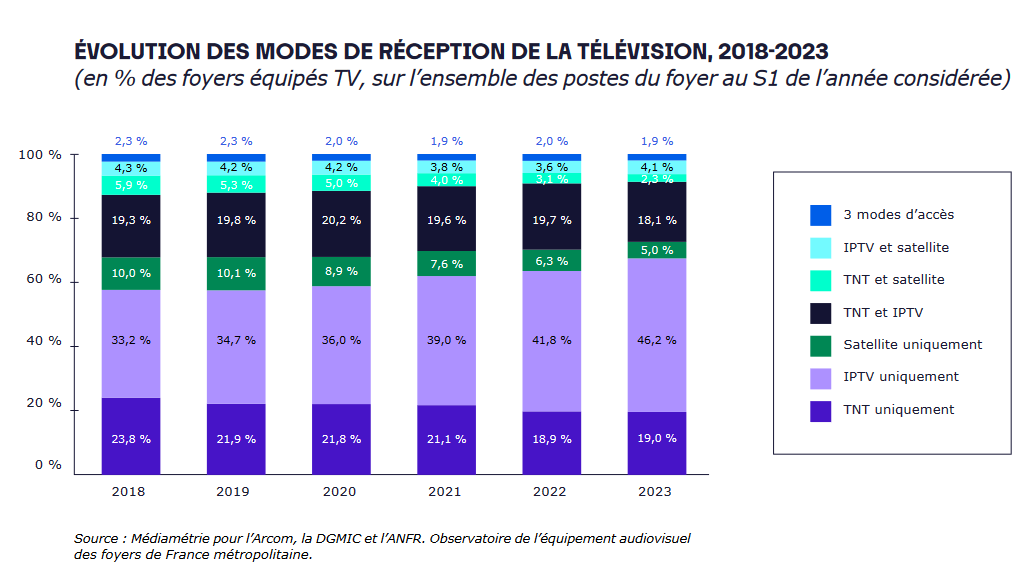 L’Arcom a publié son rapport annuel pour 2023 analysant les habitudes de consommations des Français, notamment en matière de télévision. On y note une forte progression de l’adoption de l’IPTV (réception de la télévision par internet), soit un accès via les box des opérateurs ou d’autres types d’appareils connectés au réseau. En effet, si en 2018, 33.2% des foyers équipés de télévisions utilisaient exclusivement l’IPTV, ce taux est passé, au premier trimestre 2023 à 46.2%.