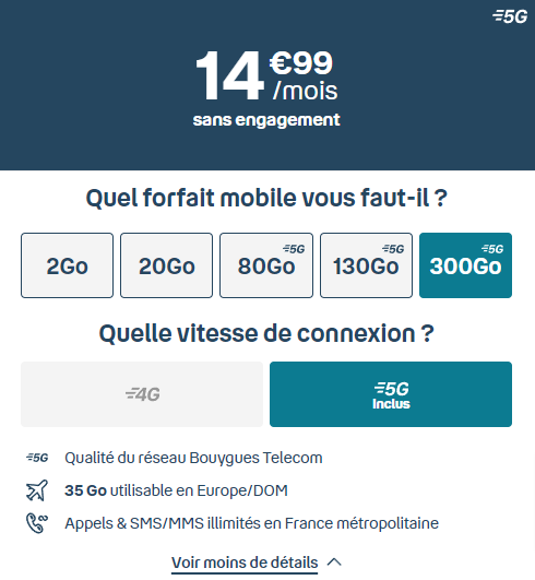 B&You propose un forfait 300 Go avec la 5G au prix de 14,99 euros par mois sans engagement. Les appels, SMS et MMS sont inclus. Lors de vos déplacements en Europe et DOM, profitez de 35 Go d’internet ainsi que des appels et SMS/MMS illimités.