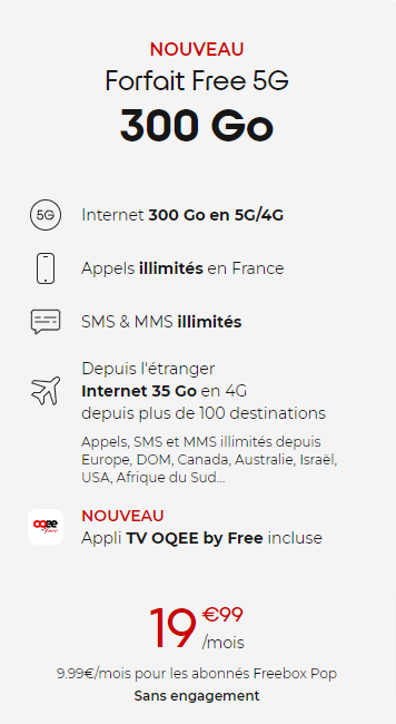 Free Mobile casse les codes depuis des années avec son forfait Free ou tout augmente sauf le prix. Actuellement le forfait Free 5G offre 300 Go d’internet pour 19,99 euros par mois. À noter que pour les abonnés Freebox Pop, le forfait est facturé 9,99 euros par mois et 15,99 euros par mois pour les autres abonnés Freebox. Ce tarif préférentiel permet également de jouir d’une enveloppe data illimitée. Les appels, SMS et MMS sont illimités en France métropolitaine. Côté voyage, le forfait Free n’est pas en reste et reste le meilleur forfait pour les globe-trotters en proposant 35 Go d’internet dans plus de 100 destinations à travers le monde. Les appels, SMS et MMS sont illimités en Europe et DOM et énormément de destinations dans le monde.