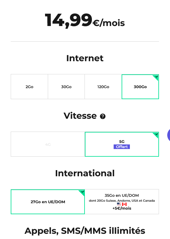 Pour Red By SFR, le forfait 300 Go en 5G est également à 14,99 euros par mois sans engagement avec appels, SMS/MMS illimités. Contrairement à celui de B&You, seulement 27 Go d’internet sont proposés en Europe et DOM ainsi que les appels, SMS et MMS illimités. Bien sûr, il est possible d’ajouter l’option à 5 euros pour bénéficier de 35 Go d’internet en Europe et DOM dont 20 Go en Suisse, Andorre, Canada et USA.