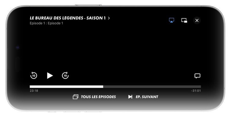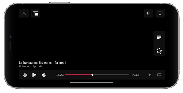Quid de l’interface ? Lorsque vous basculez votre mobile en paysage, la barre de lecture prend davantage de place : toute la largeur de la vidéo, pour faciliter le défilement du programme. Les boutons de lecture se trouvent par ailleurs au dessus de cette dernière, ainsi que le bouton servant à choisir la langue et les sous-titres.