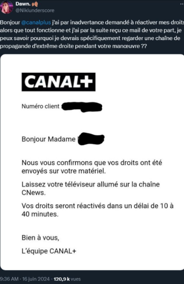 Mais Canal+ veut visiblement mettre en avant sa chaînes d’info CNews. Et depuis quelques temps, et comme le montre le mail ci-dessous, c’est désormais sur cette dernière qu’il faut rester de 10 à 40 min afin de réactiver ses droits. Bien sûr, ce n’est pas ce principe qui va influer sur l’audience de CNews, qui a été la première chaîne d’info de France le mois dernier pour la première fois, mais c’est tout de même une façon de “forcer” les abonnés Canal+ à regarder cette chaîne.