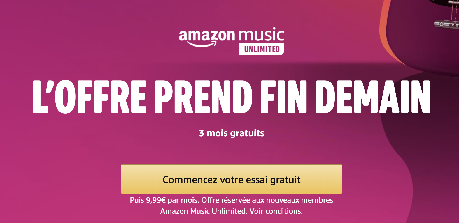 Le géant américain propose toujours 3 mois gratuits, sans engagement, sur son offre de streaming musical Amazon Music Unlimited. Il faudra cependant faire vite car ce cadeau prendra fin ce mardi 2 juin.