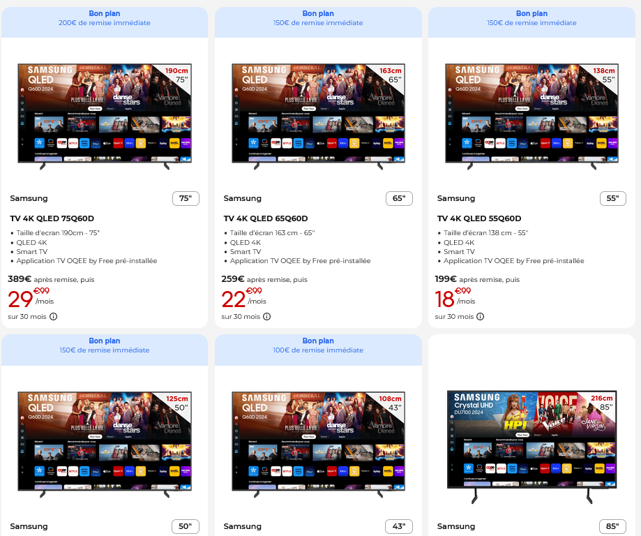 Ainsi le modèle 75 pouces Q60D est proposé avec 200€ en mois, soit 389€ puis 29.99€/mois sur trente mois, trois autres modèles bénéficient d’une remise de 150€ et pour la version 43 pouces, vous avez droit à 100€ de remise soit un téléviseur à 159€ à la commande puis 16.99€/mois pendant trente mois. Le crédit peut être remboursé à tout moment dans son intégralité. D’autres promotions sont disponibles, notamment une ODR de 200€ sur un téléviseur de 85 pouces QLED.