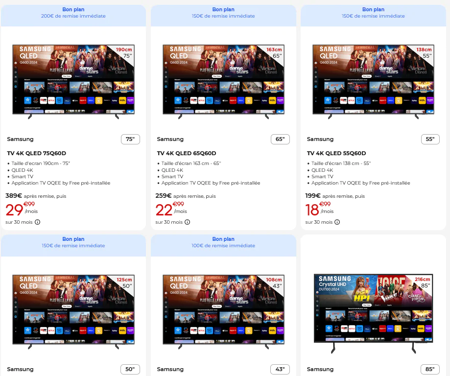 Ainsi le modèle 75 pouces Q60D est proposé avec 200€ en mois, soit 389€ puis 29.99€/mois sur trente mois, trois autres modèles bénéficient d’une remise de 150€ et pour la version 43 pouces, vous avez droit à 100€ de remise soit un téléviseur à 159€ à la commande puis 16.99€/mois pendant trente mois. Le crédit peut être remboursé à tout moment dans son intégralité. D’autres promotions sont disponibles, notamment une ODR de 200€ sur un téléviseur de 85 pouces QLED.