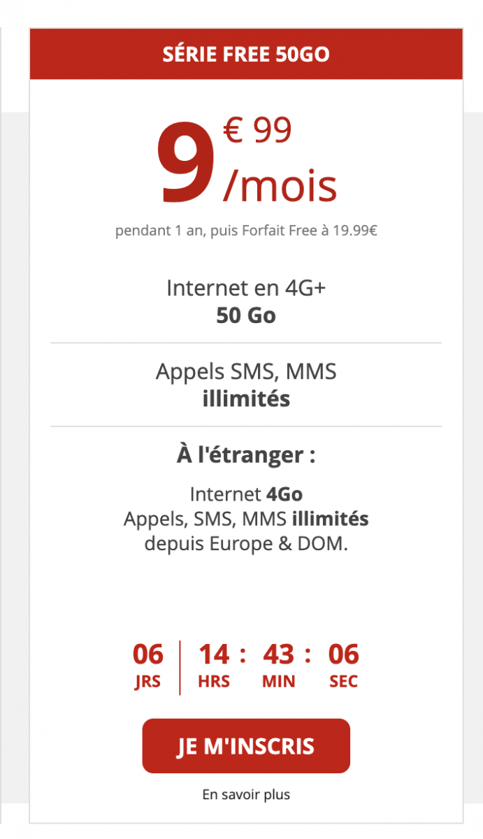 Intercalé entre les deux forfaits historiques de l’opérateur, ce forfait comprend également appels, SMS et MMS illimités et 4 Go/mois en roaming depuis Europe et DOM en 3G et 4G. A l’issue des 12 mois, les abonnés basculeront automatiquement sur le Forfait Free classique 100 Go à 19,99€/mois ou data illimitée à 15,99€/mois pour les abonnés Freebox.