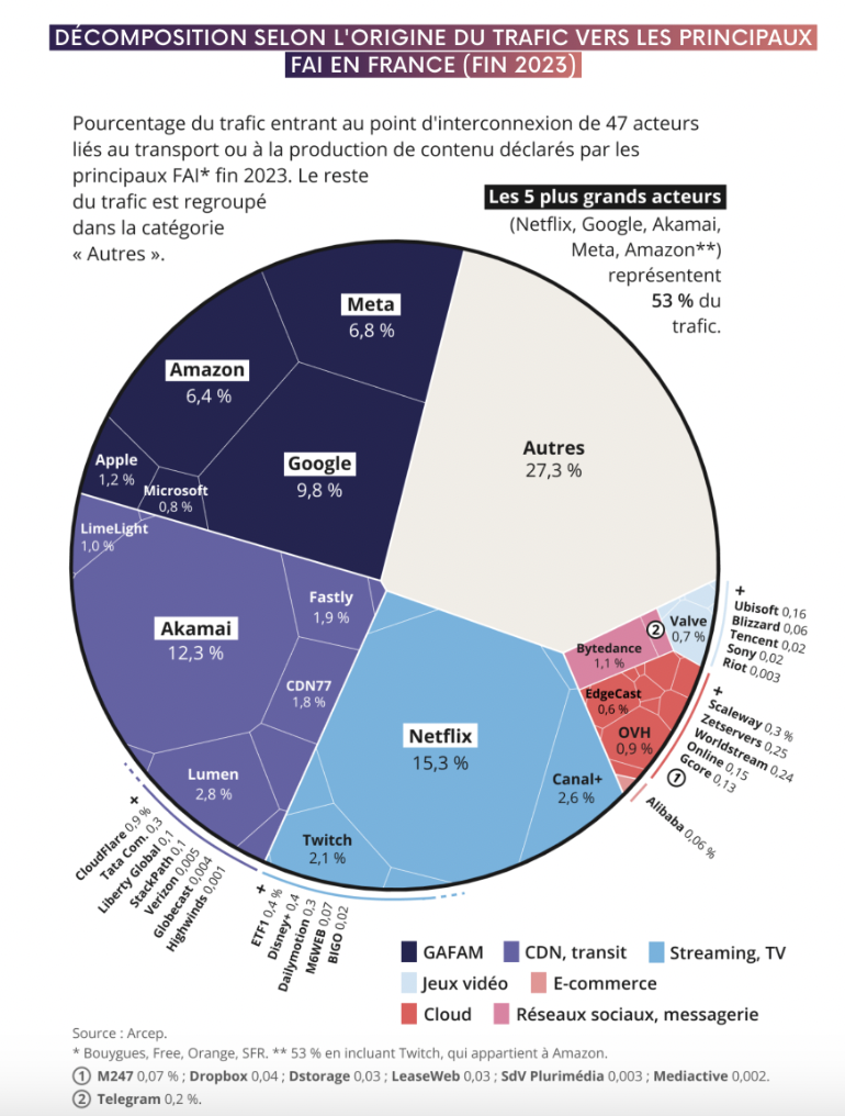 En 2023, environ 53 % du trafic internet en France provient de cinq acteurs majeurs : Netflix, Akamai, Facebook, Google, et Amazon, bien qu’une redistribution s’opère aujourd’hui vers de nouveaux acteurs comme TikTok (ByteDance).