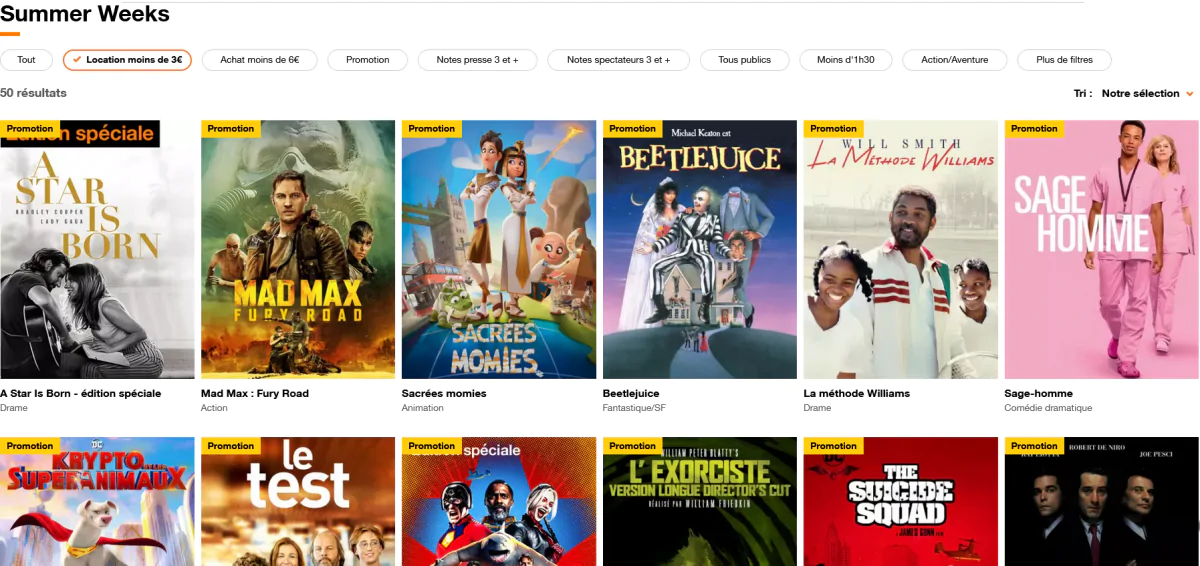 On trouve notamment 50 films disponibles en location pour 1.99€, comme Mad Max Fury Road, Beetlejuice, La méthode Williams ou encore les deux films The Suicide Squad… Vous pouvez également trouver plusieurs films disponibles à l’achat pour moins de 6€ comme Dune, Barbie, Bernadette…