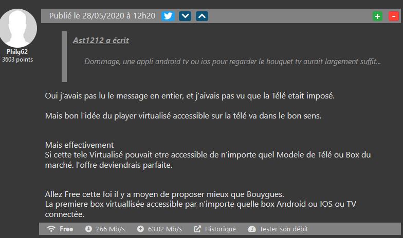 Bouygues Telecom a présenté son offre Bbox Smart TV, remplaçant le player habituel par une télévision connectée. Si l’innovation est là, certains regrettent que l’opérateur ne soit pas allé plus loin et n’ait pas décidé de simplement proposer une application compatible avec tous les téléviseurs connectés ou tous les supports… Free aurait ses cartes à jouer, ou en tout cas, c’est ce que pense Philg62 ! Et vous,qu’en pensez vous ?