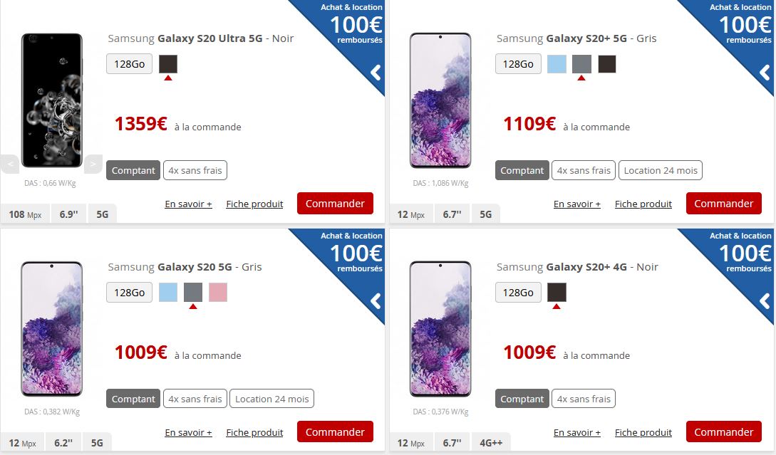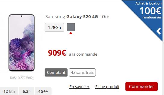 - Toujours en 5G, le Galaxy S20 est proposé à 1009€ au comptant. En quatre fois sans frais, il faudra payer 511€ puis trois fois 166€. La location est toujours disponible, avec un premier paiement de 329€ puis 20€/mois pendant 24 mois.