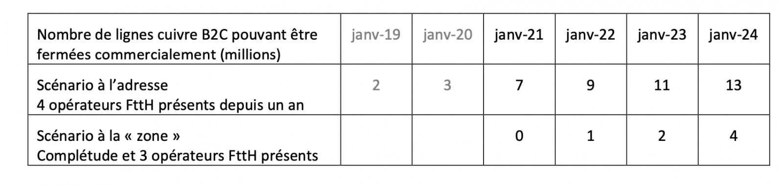 Pour minimiser ces dépenses futures, il est urgent pour l’opérateur d’arrêter la commercialisation du cuivre en 2020 pour la clientèle résidentielle, en particulier “pour les 8 millions de logements FttH où les quatre principaux opérateurs sont simultanément présents.” Car dans le cas où un seul opérateur fournit du cuivre aux abonnés emménageant dans un logement éligible à la fibre, “il détruit la disposition à payer des propriétaires pour réaliser les travaux permettant le fibrage de leur logement”.