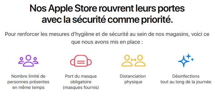 Comme dans de nombreux commerces, la distanciation physique et les désinfections plusieurs fois dans la journée seront de mise, évidemment. Le masque sera obligatoire, tant pour les employés que pour les clients et si vous n’en possédez pas, Apple vous en fournira un à l’entrée. La capacité des boutiques sera quant à elle réduite, avec un nombre limité de personne autorisé à y entrer en même temps.