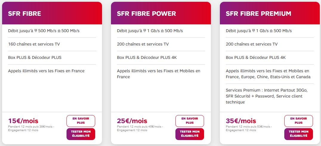 Chaque offre fixe de SFR (SFR Fibre, SFR Fibre Power et SFR Fibre Premium) est compatible avec cette formule. Cependant, le tarif de ces abonnements, en plus d’un engagement 24 mois contre 12 habituellement, augmente de 10€ par rapport à l’offre “normale” proposée par l’opérateur au carré rouge.