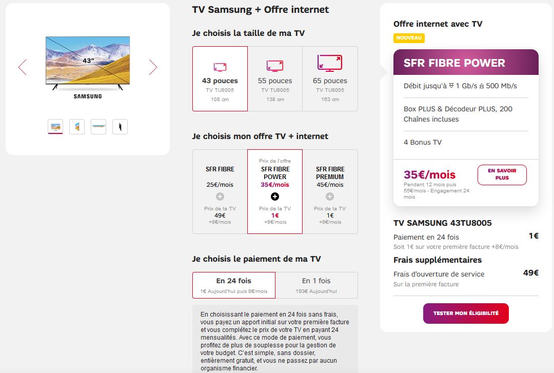 L’abonné a le choix entre trois modèles de téléviseurs Samsung, tous de la gamme TU8005, respectivement de 43, 55 et 65 pouces. Chacun sera proposé à un tarif différent selon le modèle et les offres que vous choisirez lors de la souscription.
