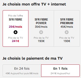 La formule Box+TV est disponible uniquement pour les nouveaux abonnés Fibre de SFR, et sera proposée durant l’été aux abonnés actuels de l’opérateur. Deux options de paiement sont proposées, à savoir le paiement en 24 fois qui permet ainsi d’étaler le coût du téléviseur sur la durée, ou l’achat en une fois. L’engagement reste le même peu importe votre choix.