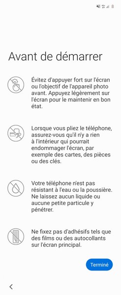 Au démarrage de l’appareil, Samsung ne manque d’ailleurs pas de rappeler qu’il faudra se montrer soigneux, en évitant notamment d’appuyer trop fort ou en vérifiant l’absence de corps étrangers au moment du pliage. Il faudra également le garder éloigné de l’eau et de la poussière.