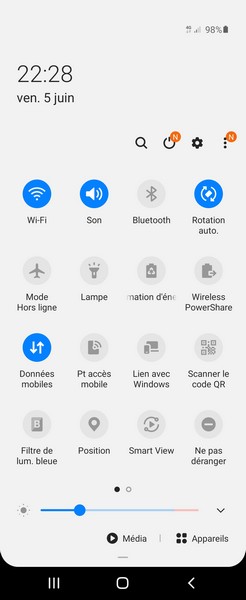 Notez également la charge sans-fil qui nous a permis de faire le plein sur le player Freebox Delta et la charge sans-fil inversée qui nous permis de remplir un peu la batterie d’un iPhone 11 (icône Wireless PowerShare dans le panneau des raccourcis).
