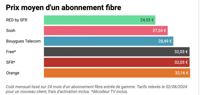 En lissant le coût mensuel sur 24 mois pour un forfait fibre d’entrée de gamme pour un nouveau client, frais d’activation inclus, Ariane dresse un classement des opérateurs. Red by SFR arrive en tête avec un prix moyen moins élevé (24,53€), devant Sosh (27,4€) et Bouygues Telecom (28,48€). Ces trois opérateurs ne proposent toutefois pas de décodeur TV inclus dans leur offre la plus attractive, à contrario de Free et SFR qui affichent un prix moyen de 32,03€. Orange ferme la marche (32,16€).