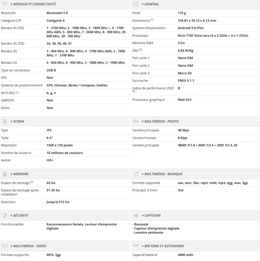 S’il en partage en partie le nom, ce smartphone se démarque du P40 Lite par de nombreux aspects. Côté photo, par exemple, il bénéficie d’un triple capteur photo (contre un quadruple pour le grand frère) avec un capteur principal de 48 Mpx et une caméra frontale à 8 Mpx. Il embarque un chipset Kirin 710F et tourne sous Android 9.0 avec 4Go de RAM. Comptez également sur un stockage de 64Go extensible jusqu’à 512 Go avec une carte micro-SD. Et comme son nom l’indique, ce modèle est compatible avec la bande fréquence 700 MHz. Pour rappel, les services Google ne sont pas présents sur cette gamme de smartphone, dû aux désaccords entre le fabricant et le gouvernement des Etats-Unis. Vous pouvez retrouver l’intégralité de la fiche technique ci-dessous, ou en cliquant sur ce lien.