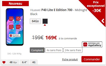 Le Huawei P40 Lite E est disponible pour 169€ au lieu de 199€ au comptant, pour sa version 64 Go dans un coloris Midnight Black. Vous pouvez également vous le payer en 4 fois sans frais, pour 43€ au lieu de 73€ lors de la commande, puis trois fois 42€ sans frais. Si vous désirez échelonner le paiement sur une plus longue période, optez pour le 24 fois sans frais, moyennant 49€ au lieu de 79€ pour le premier paiement, puis 24 fois 5€.